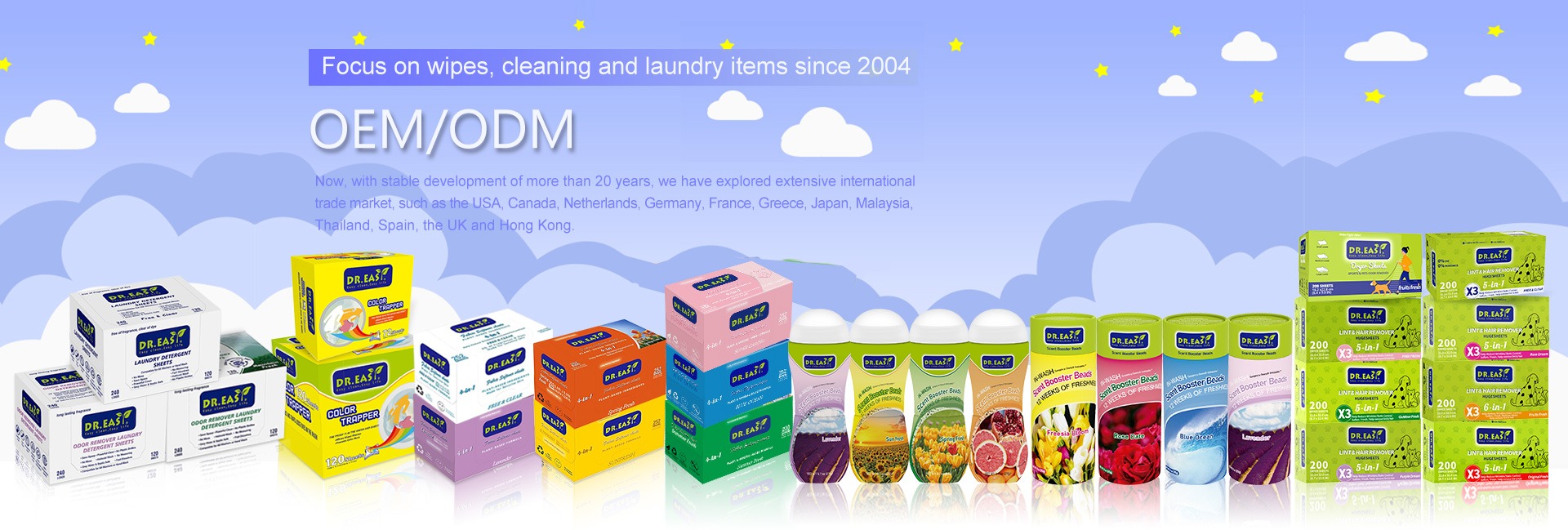 Productos principales:Hojas de secadora, potenciador de aroma, toallitas húmedas y secas, hojas de detergente para ropa, polvo para alfombras